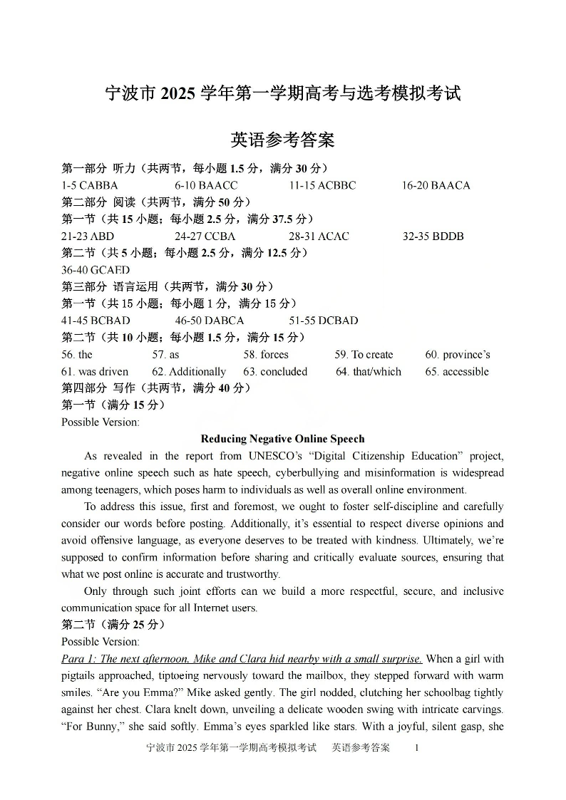 宁波市2025学年第一学期高考模拟考试 英语答案.pdf