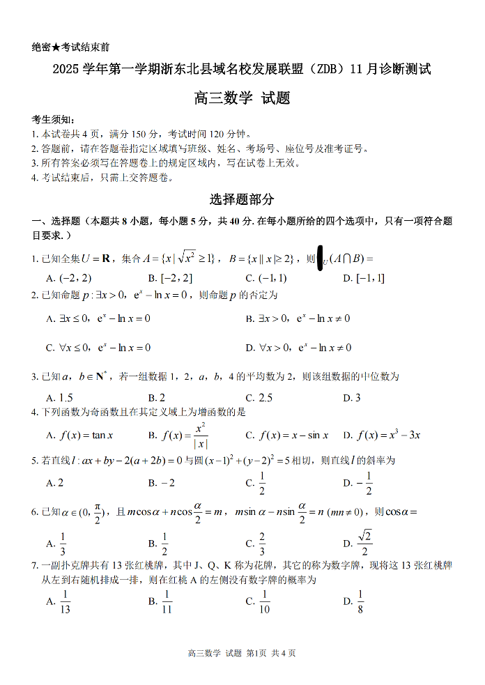 2025学年第一学期浙东北县域名校发展联盟(ZDB)11月诊断测试 数学.pdf