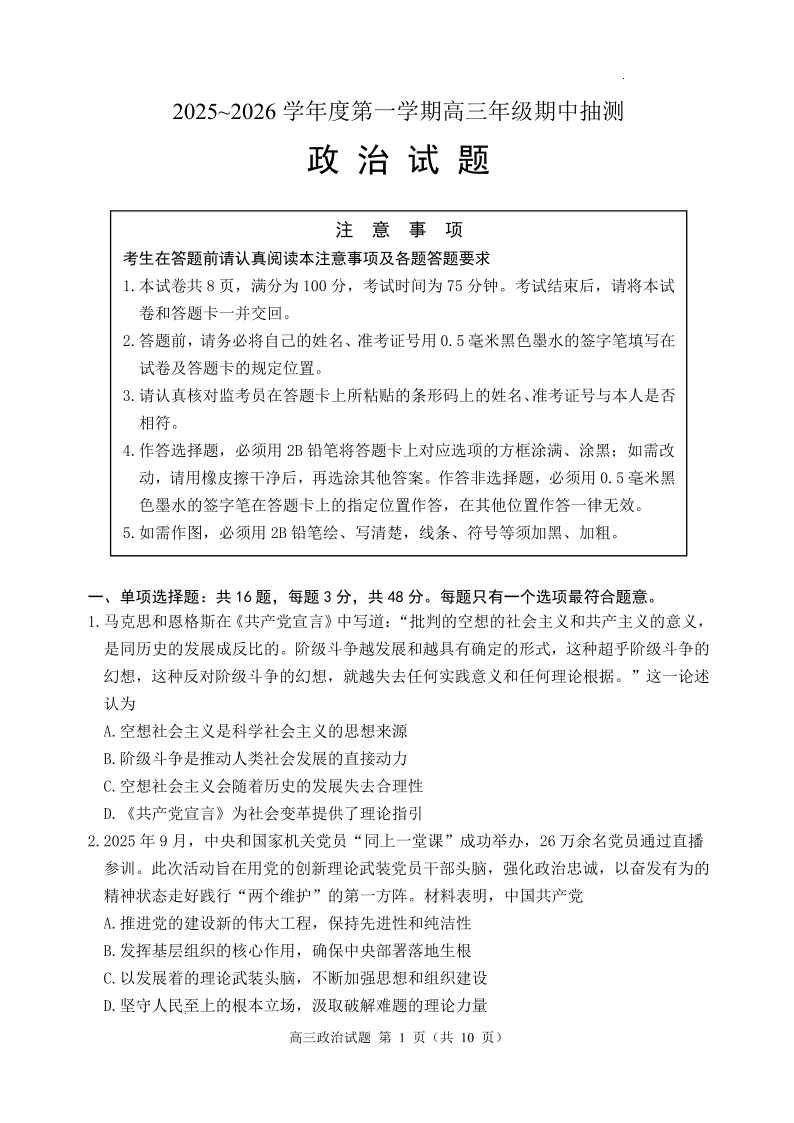 徐州市2025~2026学年度第一学期高三年级期中抽测 政治.pdf