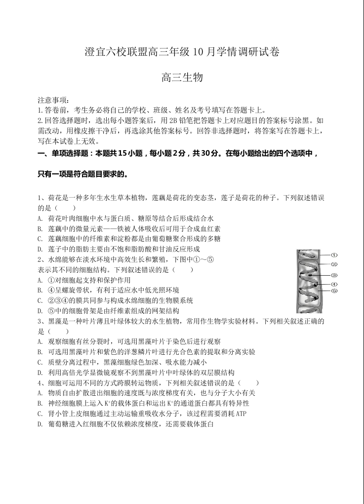 江苏省澄宜六校联盟2025-2026学年高三上学期10月学情调研 生物.docx
