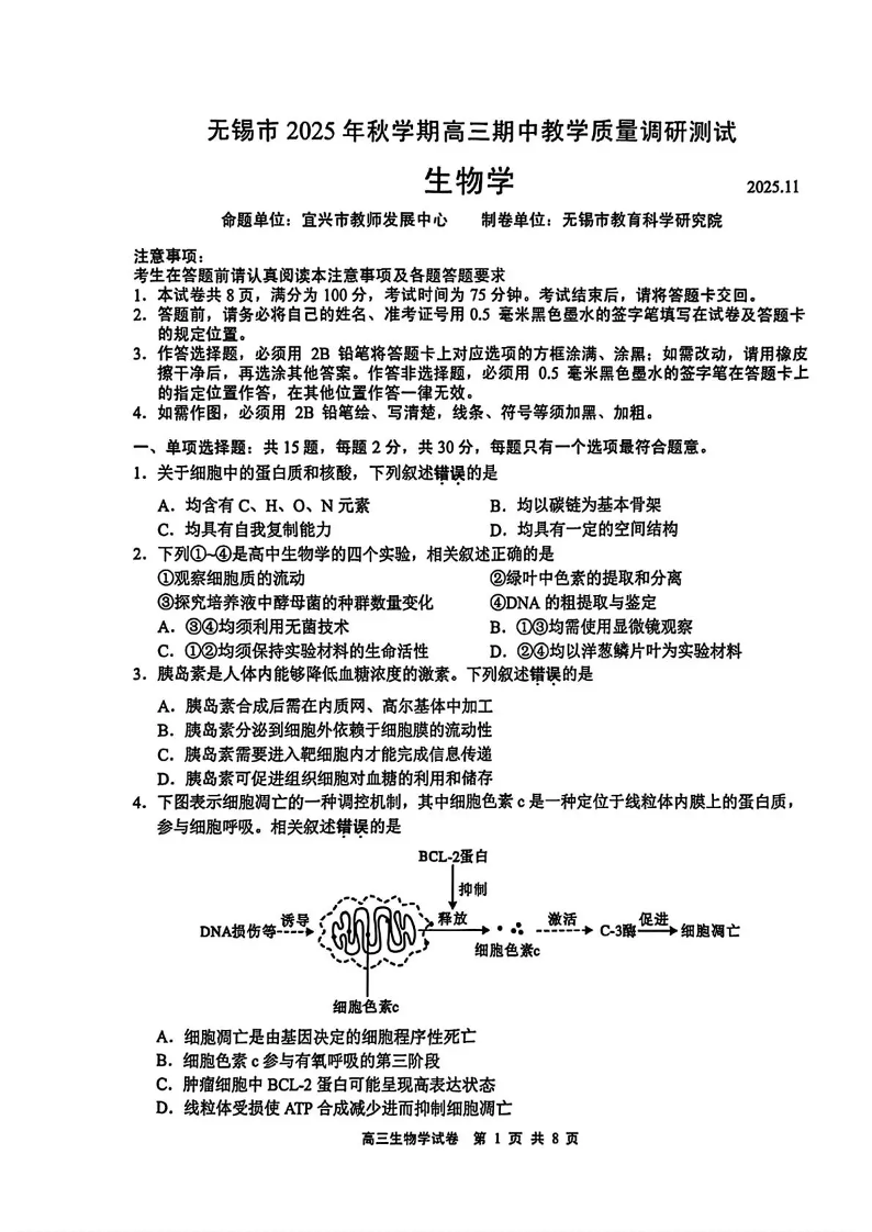 无锡市2025年秋学期高三期中教学质量调研测试 生物.pdf
