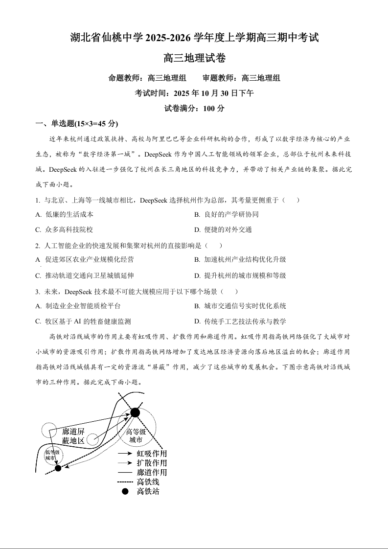 湖北省仙桃中学2025-2026学年高三上学期期中考试 地理.docx