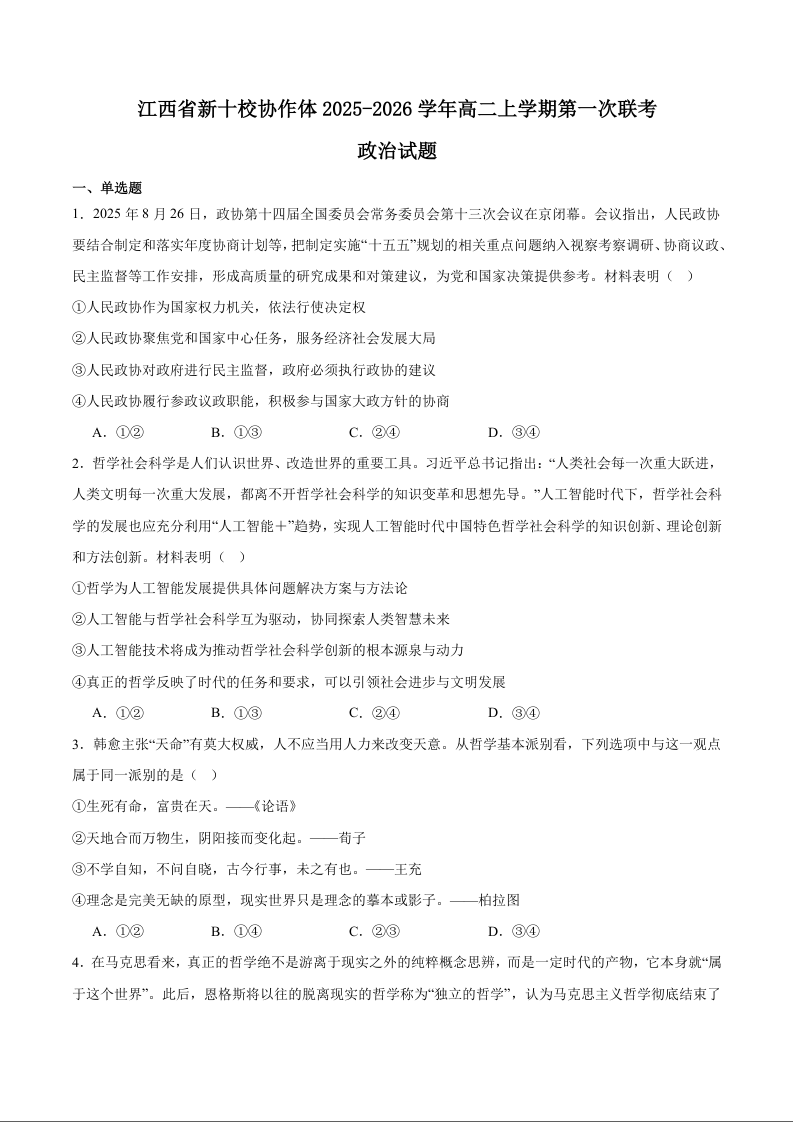江西省新十校协作体2025-2026学年高二上学期第一次联考 政治试题(含答案).docx