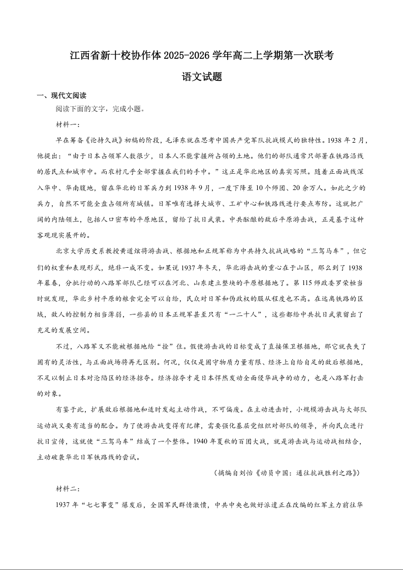 江西省新十校协作体2025-2026学年高二上学期第一次联考 语文试题(含答案).docx