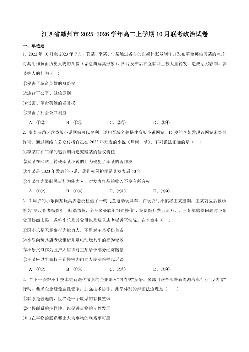 江西省赣州市2025-2026学年高二上学期10月联考 政治试题(含答案).docx