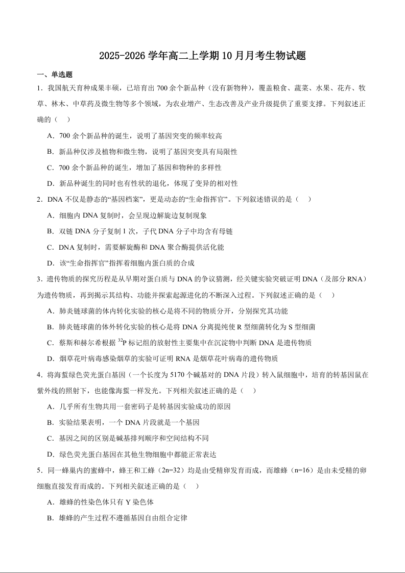 江西省赣州市2025-2026学年高二上学期10月联考 生物试题(含答案).docx