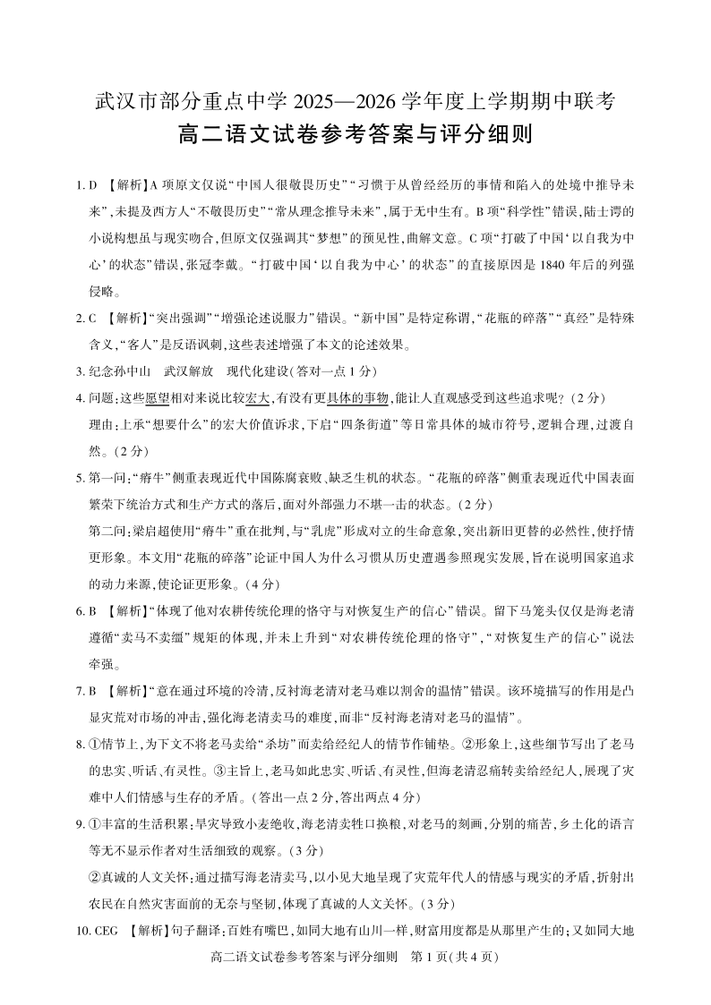 武汉市部分重点中学2025-2026学年度上学期高二期中联考 语文答案.pdf