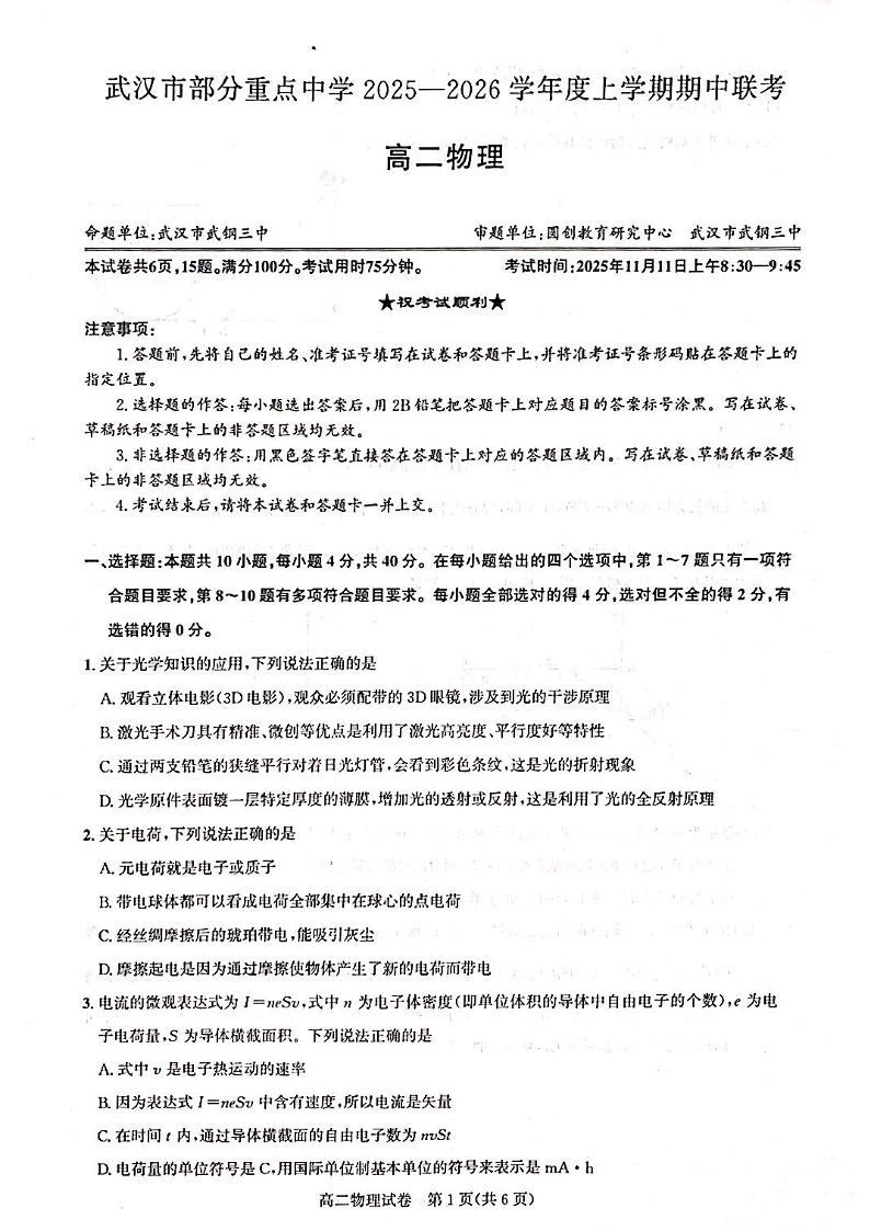 武汉市部分重点中学2025-2026学年度上学期高二期中联考 物理.pdf