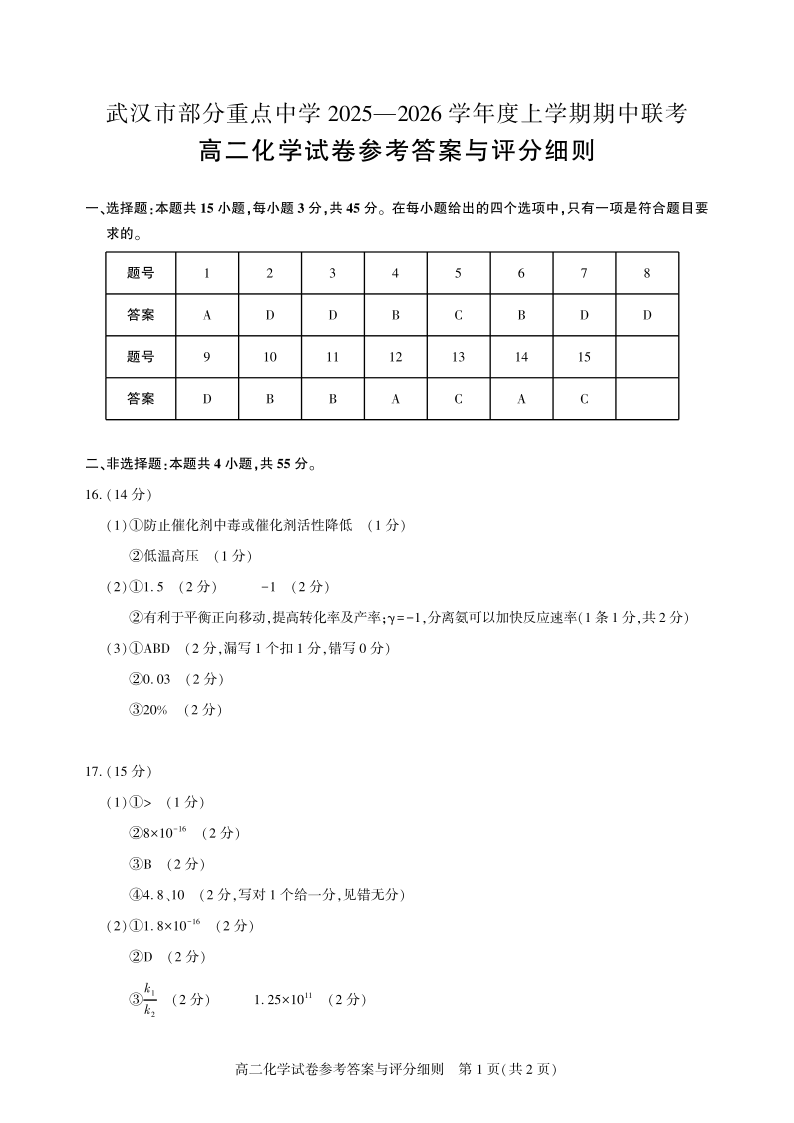武汉市部分重点中学2025-2026学年度上学期高二期中联考 化学答案.pdf