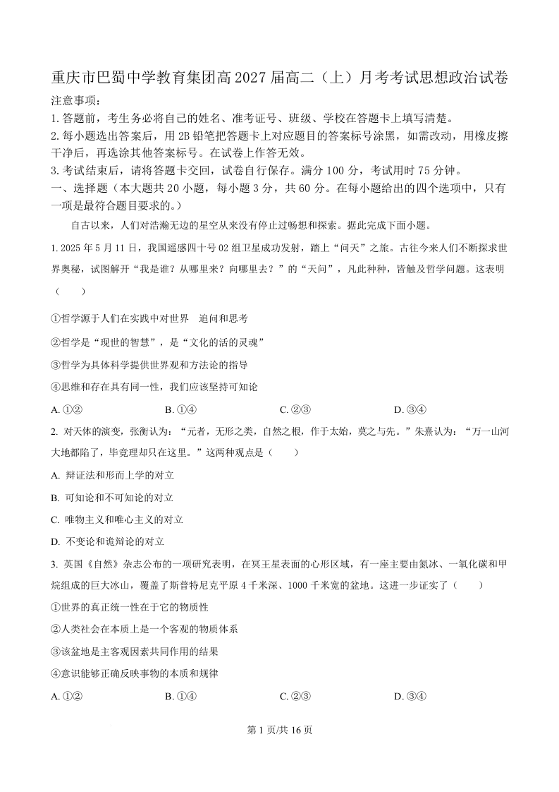 重庆市巴蜀中学2025-2026学年高二上学期10月月考 政治答案.docx