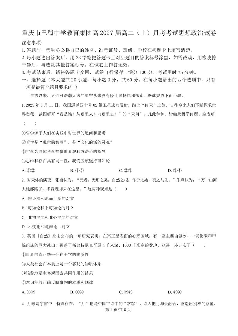 重庆市巴蜀中学2025-2026学年高二上学期10月月考 政治.docx