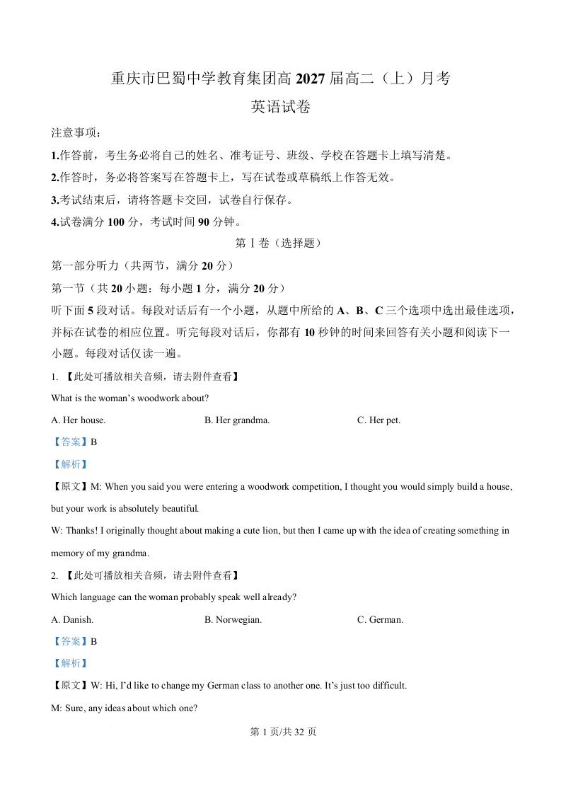 重庆市巴蜀中学2025-2026学年高二上学期10月月考 英语答案.docx