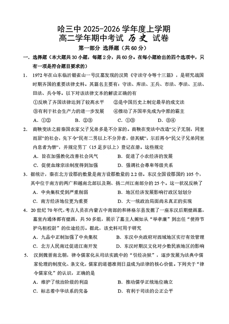 黑龙江省哈三中2025-2026学年度上学期高二学年期中考 历史试题(含答案).pdf