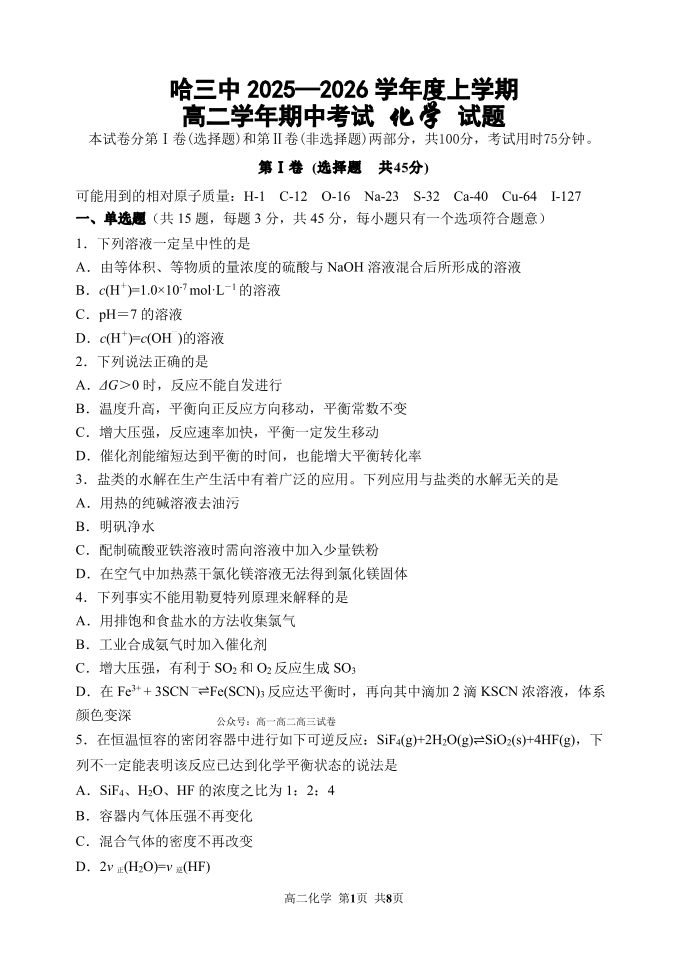 黑龙江省哈三中2025-2026学年度上学期高二学年期中考 化学试题(含答案).pdf