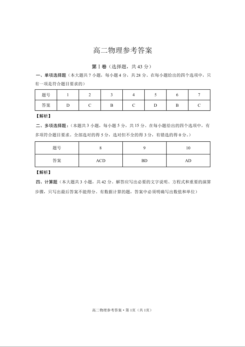贵阳一中2024级高二年级教学质量监测卷(一)物理-答案.docx