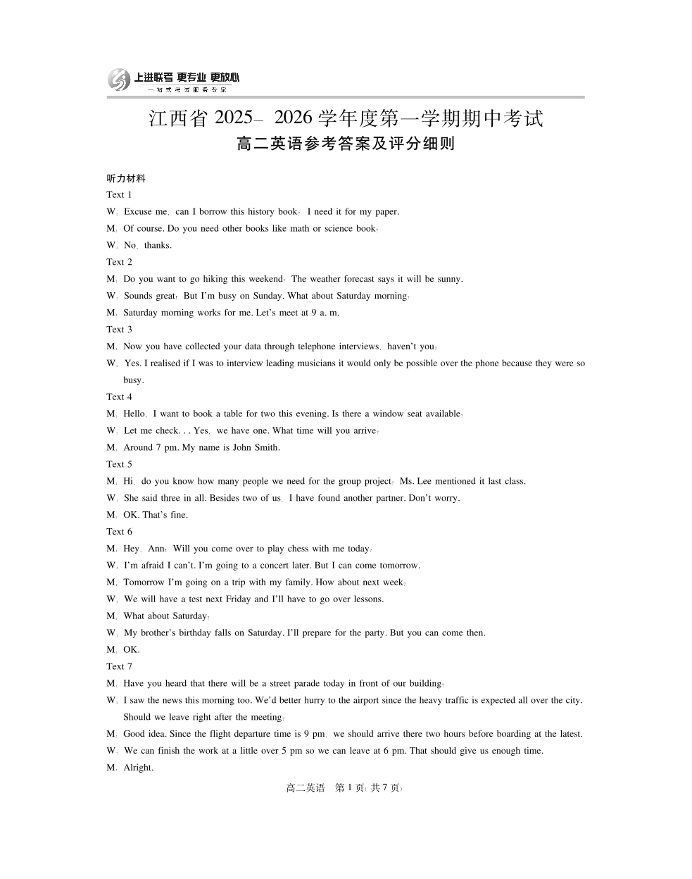 江西省上进联考2025-2026学年高二上学期11月期中考试·英语答案.pdf
