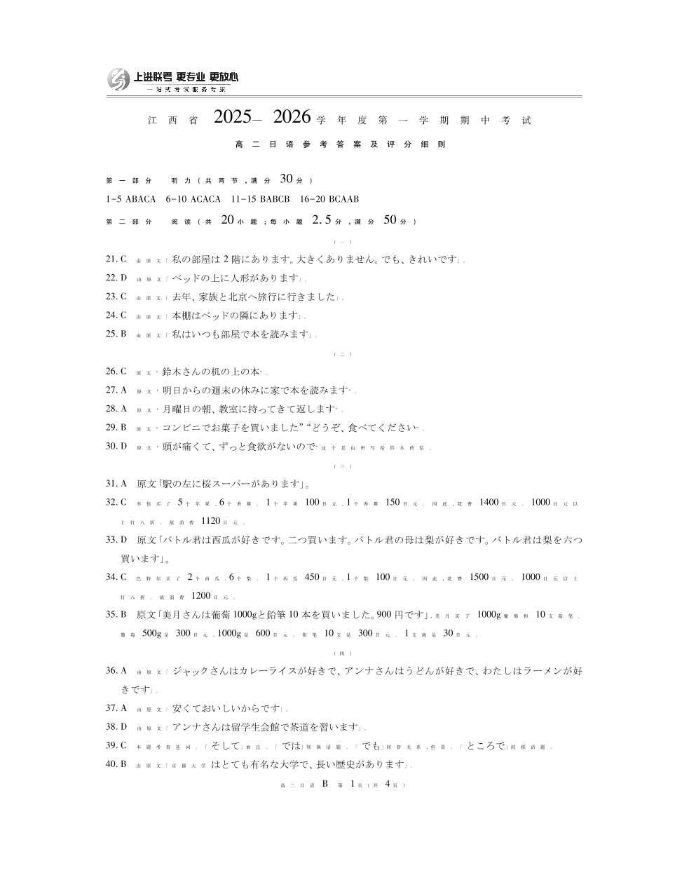 江西省上进联考2025-2026学年高二上学期11月期中考试·日语B卷答案.pdf