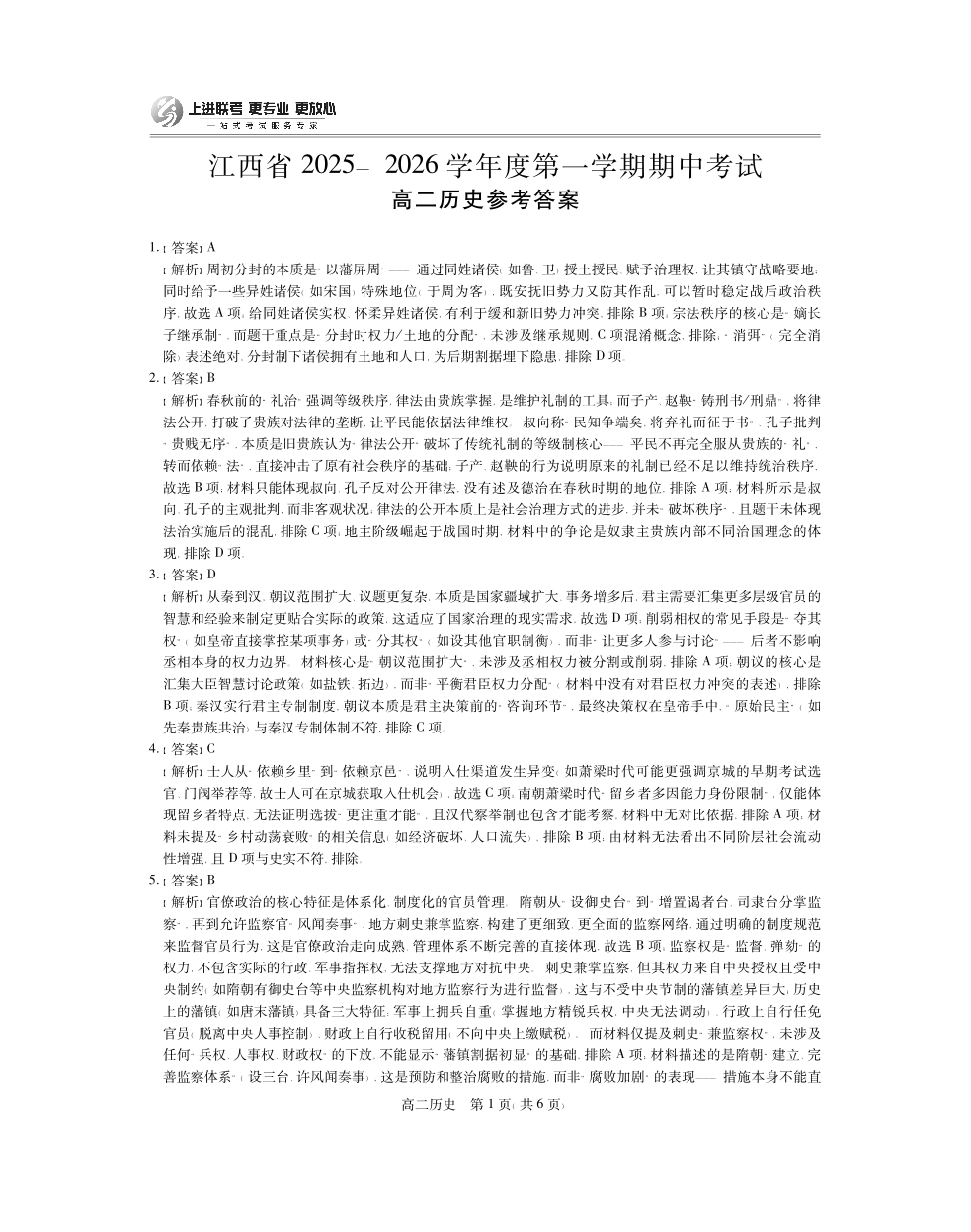 江西省上进联考2025-2026学年高二上学期11月期中考试·历史答案.pdf