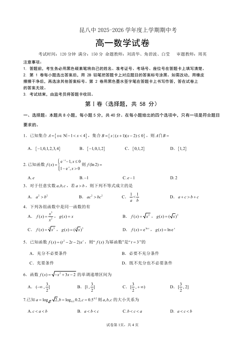 昆明八中2025-2026学年度高一上学期期中考 数学试题(含答案).pdf
