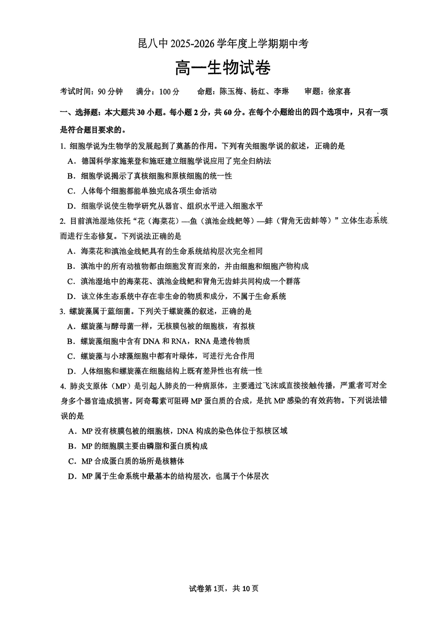 昆明八中2025-2026学年度高一上学期期中考 生物试题(含答案).pdf