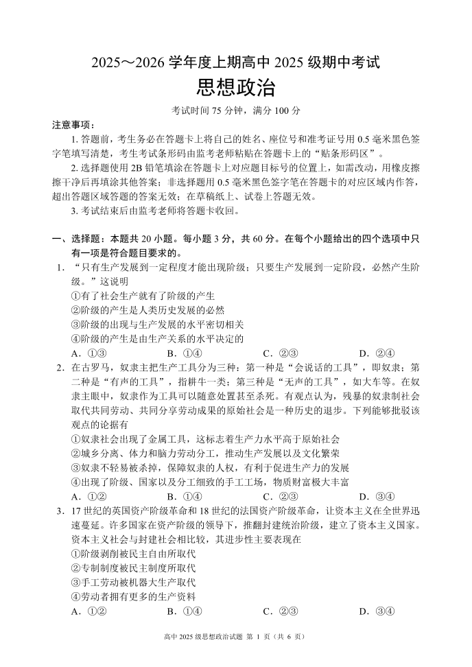 2025~2026学年度上期高中2025级期中考试 政治.pdf