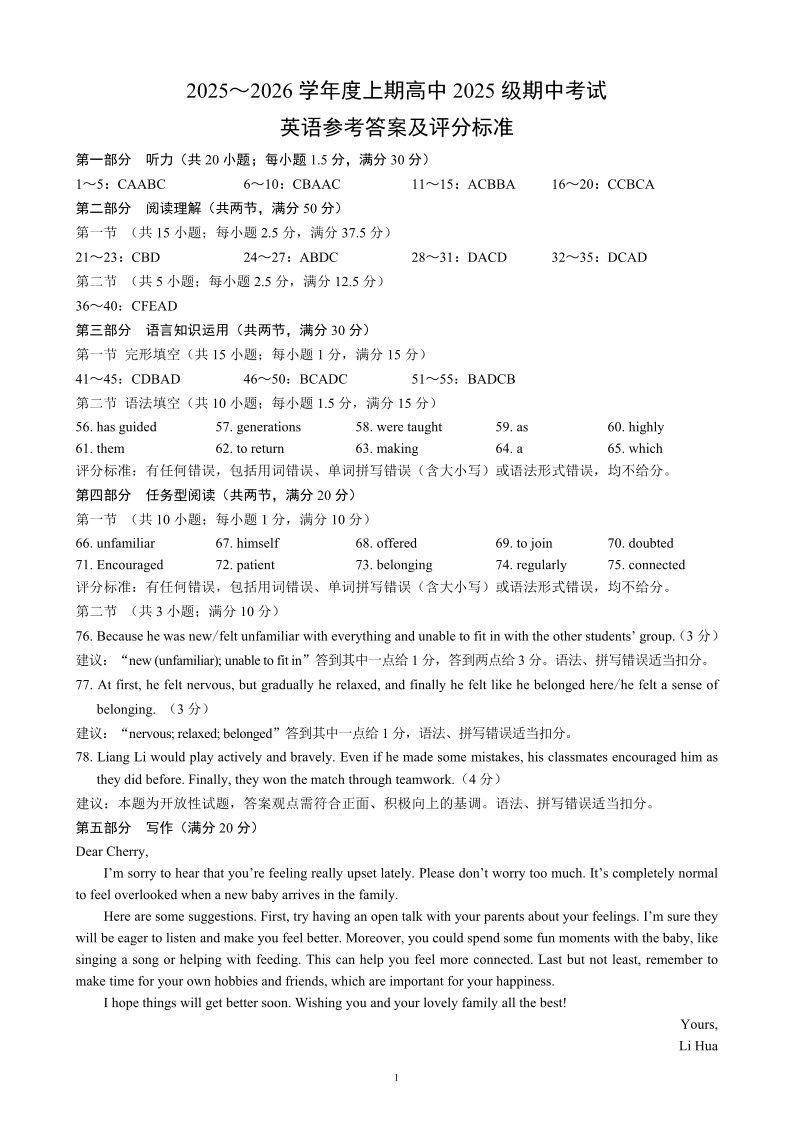 2025~2026学年度上期高中2025级期中考试 英语参考答案及评分标准.pdf