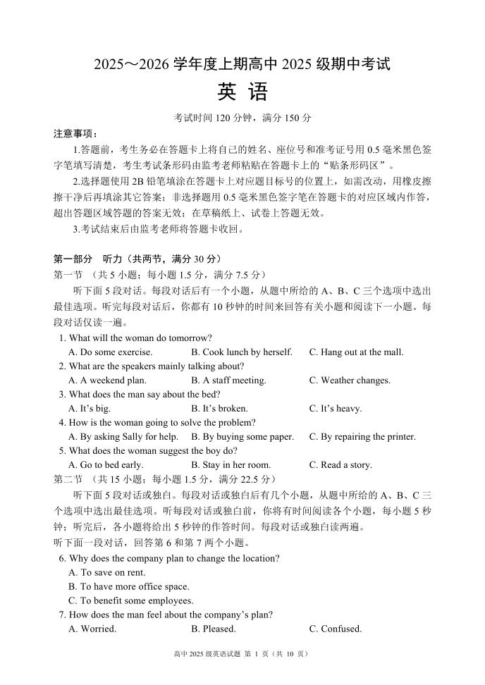 2025~2026学年度上期高中2025级期中考试 英语.pdf