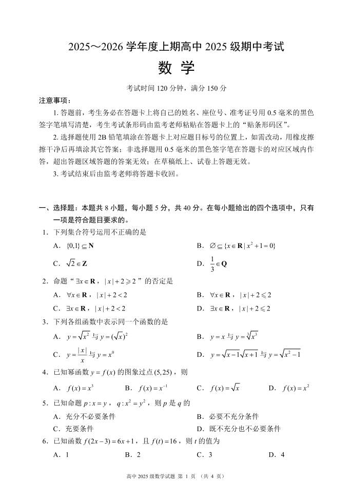 2025~2026学年度上期高中2025级期中考试 数学.pdf