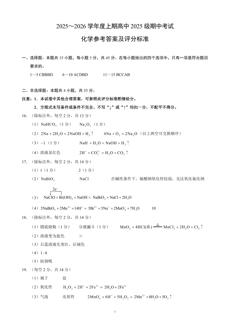 2025~2026学年度上期高中2025级期中考试 化学参考答案及评分标准.pdf
