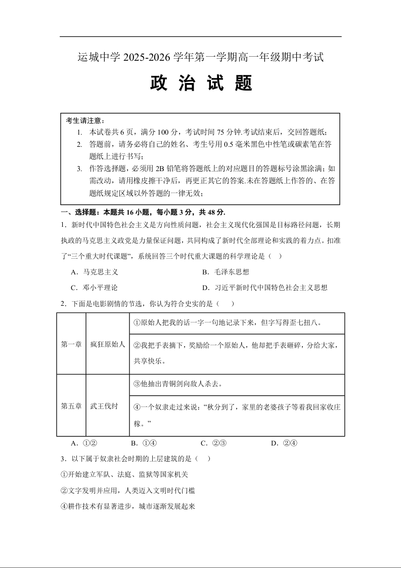 山西省运城中学2025-2026学年高一上学期期中考试 政治.docx