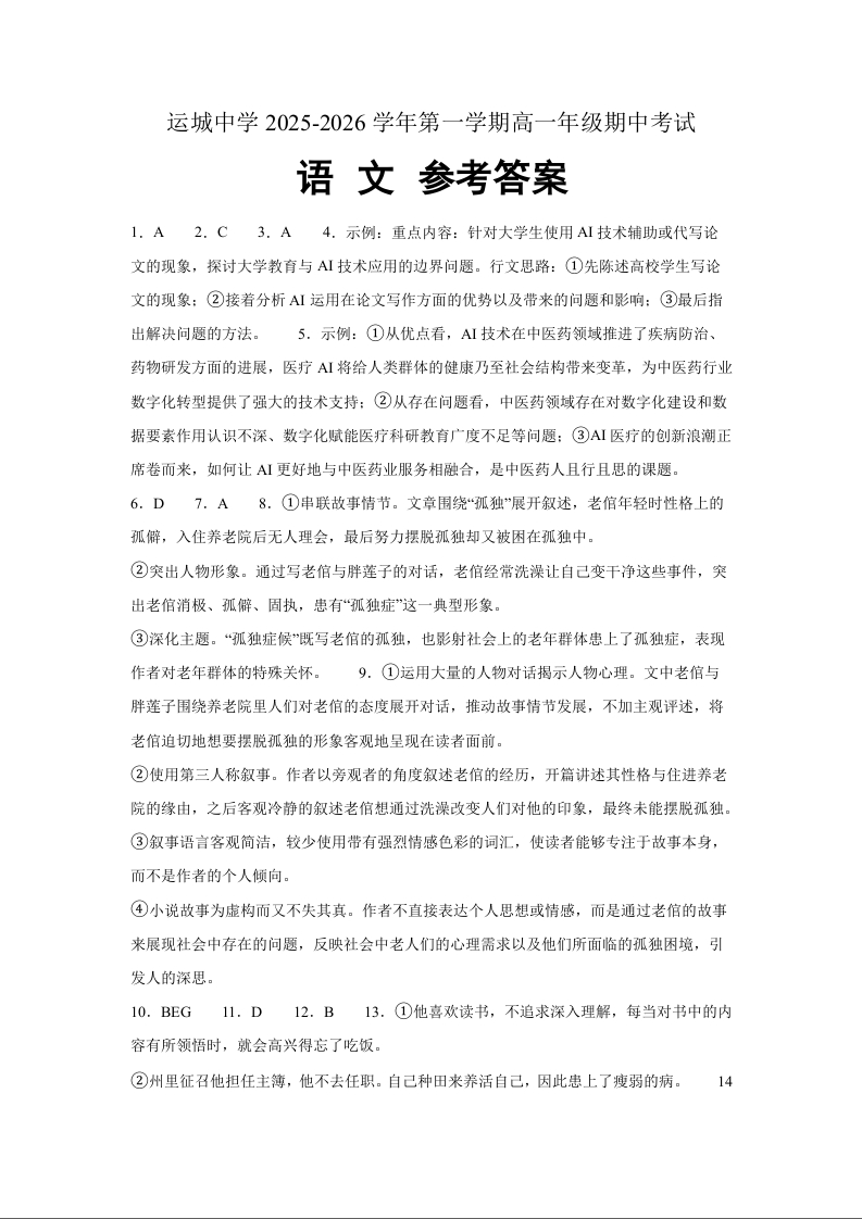 山西省运城中学2025-2026学年高一上学期期中考试 语文答案.docx