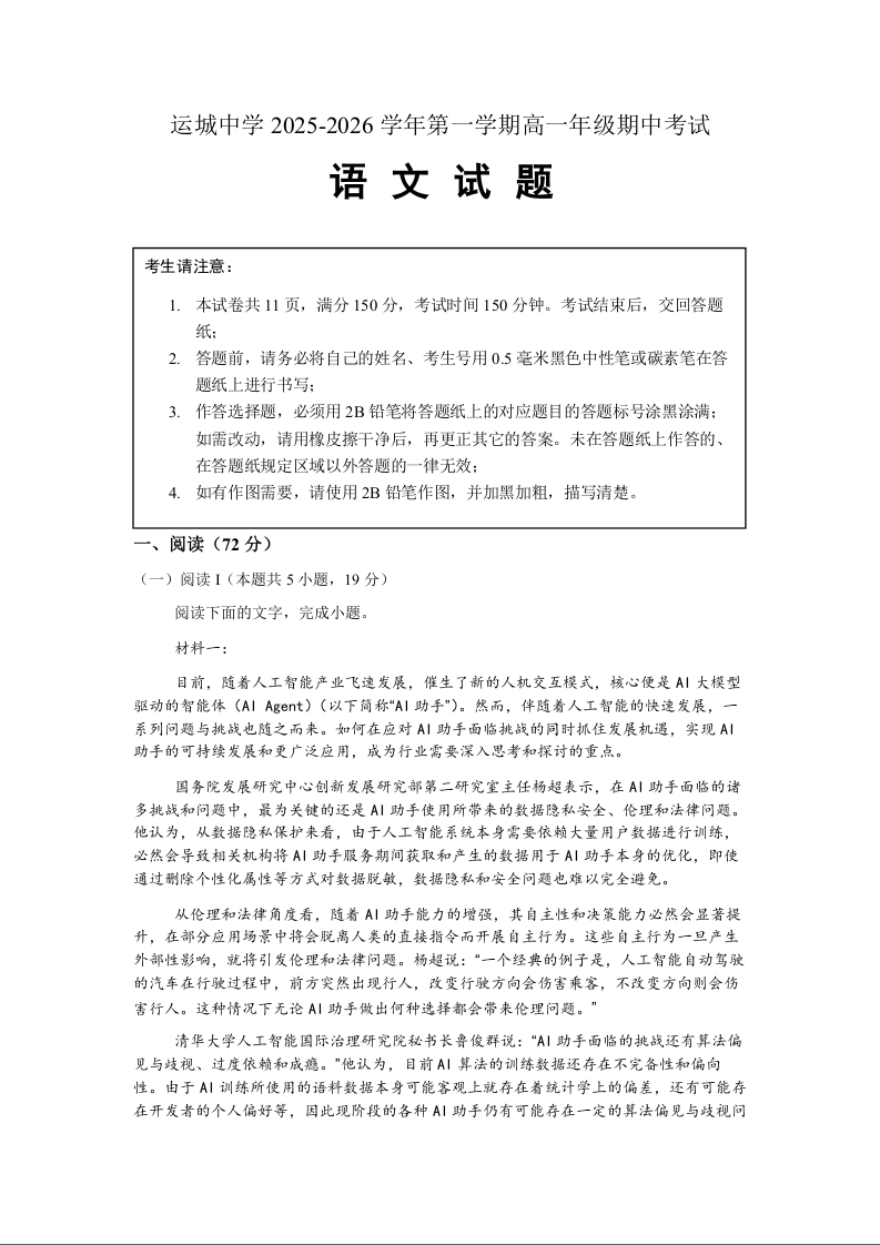 山西省运城中学2025-2026学年高一上学期期中考试 语文.docx