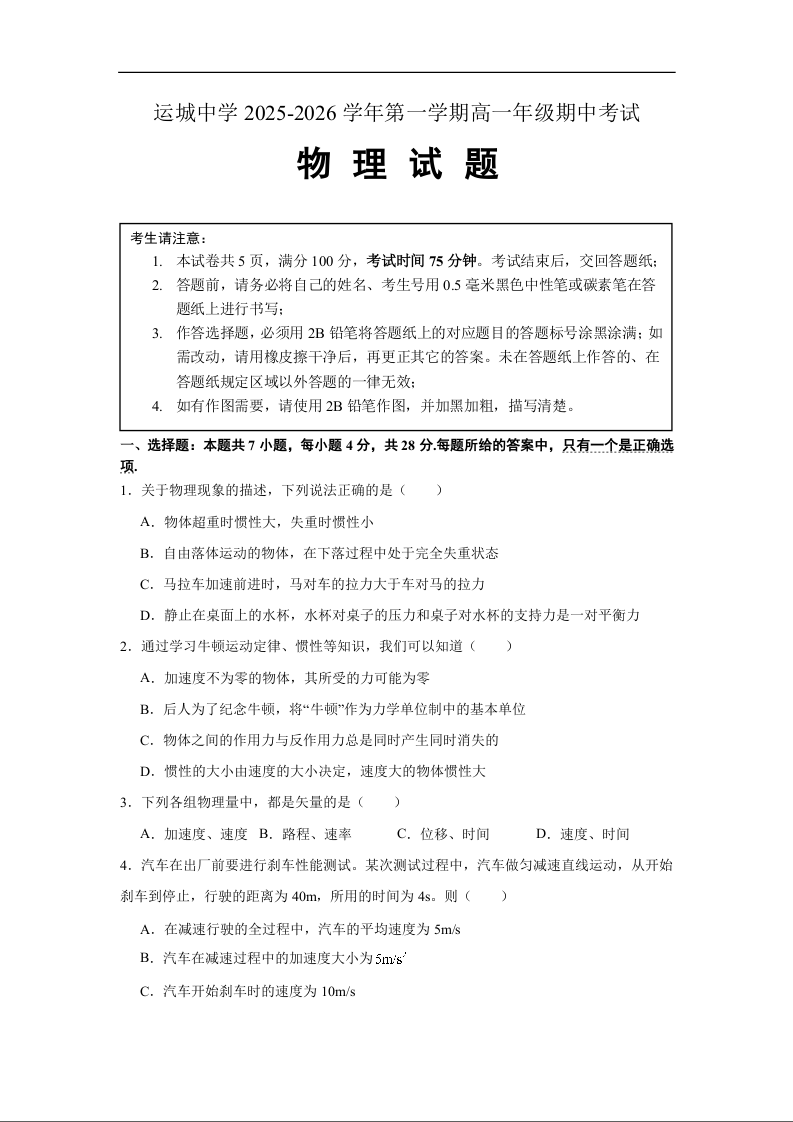 山西省运城中学2025-2026学年高一上学期期中考试 物理.docx