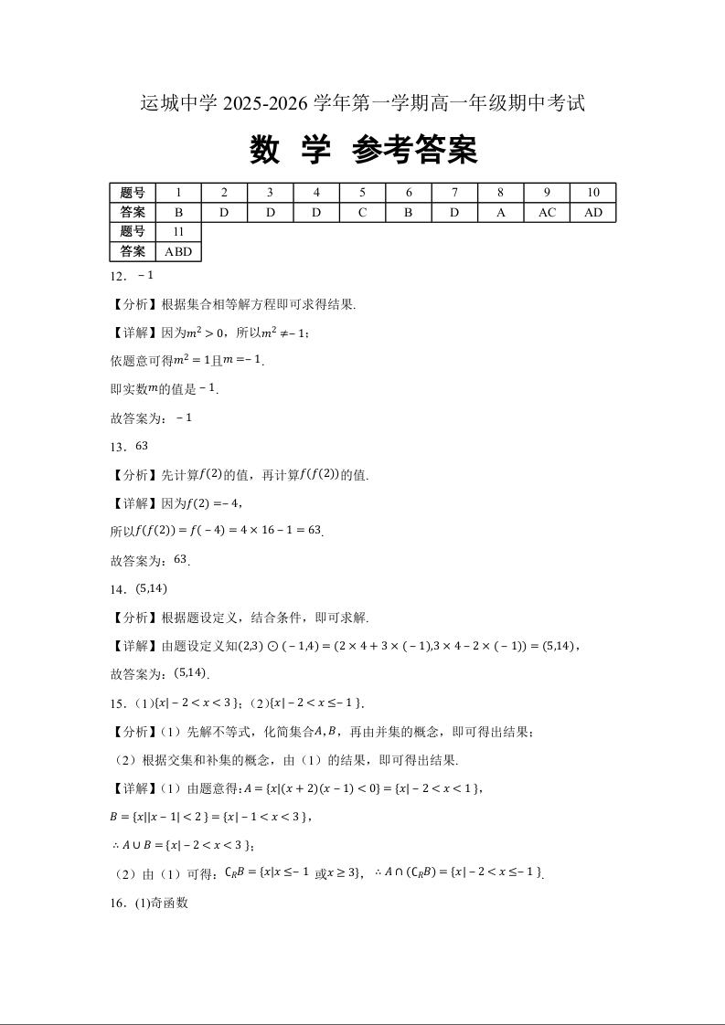山西省运城中学2025-2026学年高一上学期期中考试 数学答案.docx