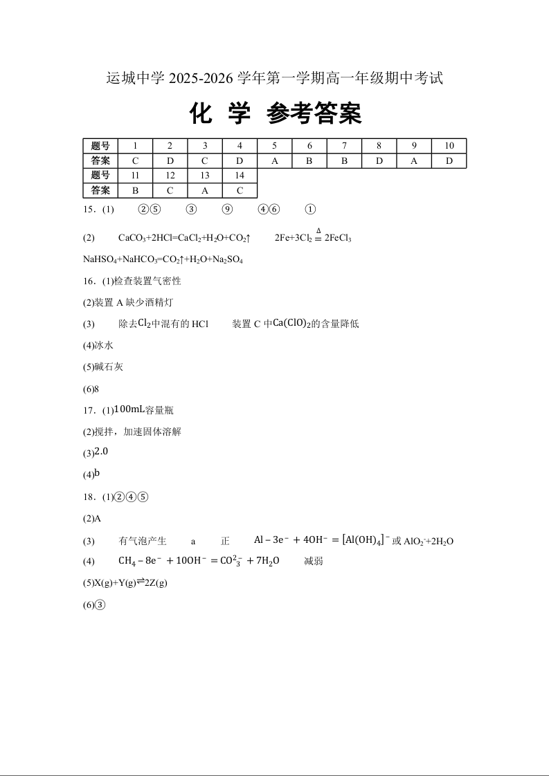 山西省运城中学2025-2026学年高一上学期期中考试 化学答案.docx