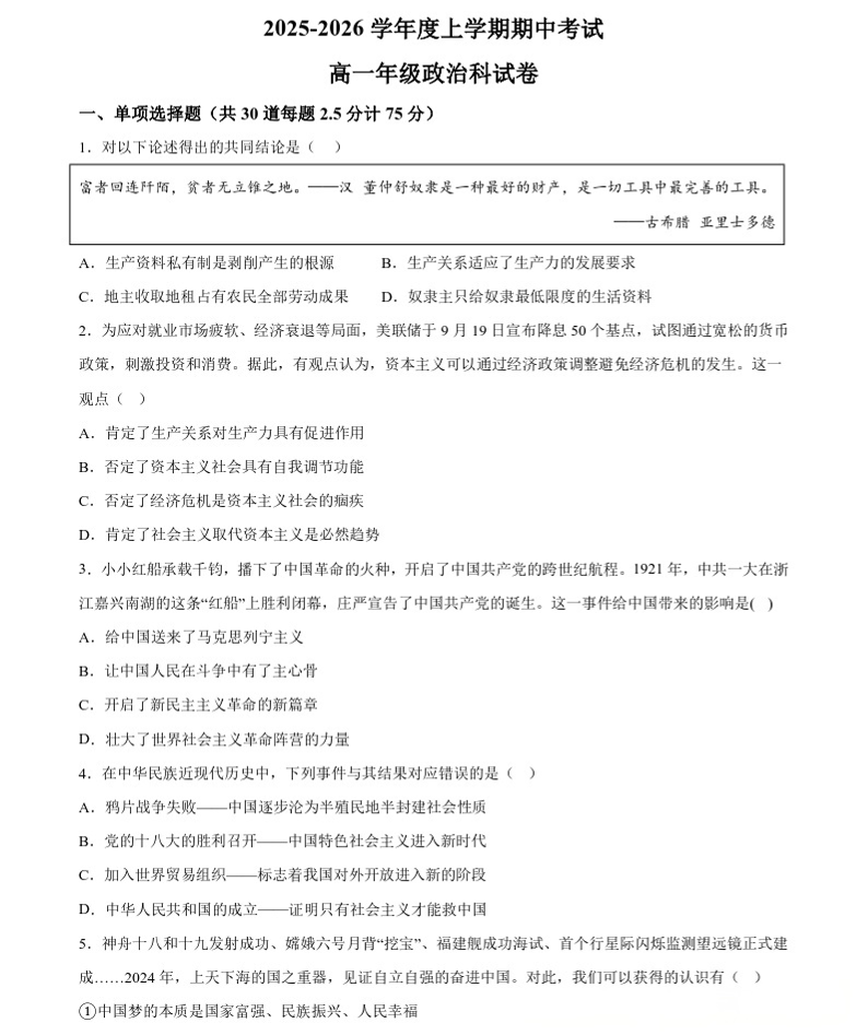 辽宁省大连市第二十四中学2025-2026高一(上)期中考试 政治试题(含答案).pdf