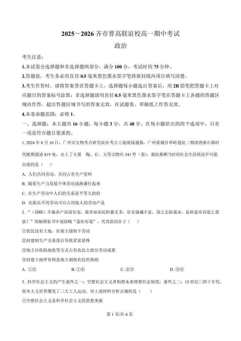 黑龙江省齐齐哈尔市普高联谊校2025-2026学年高一上学期期中考试 政治.docx