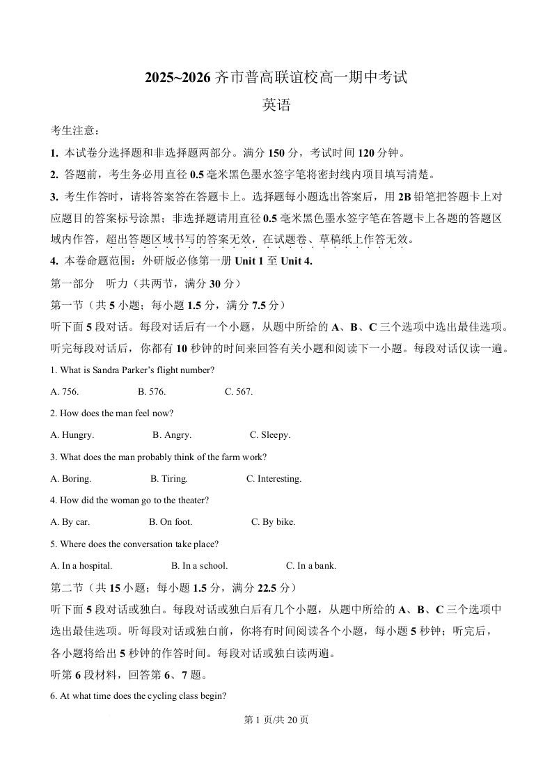 黑龙江省齐齐哈尔市普高联谊校2025-2026学年高一上学期期中考试 英语答案.docx