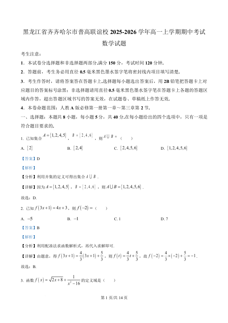 黑龙江省齐齐哈尔市普高联谊校2025-2026学年高一上学期期中考试 数学答案.docx