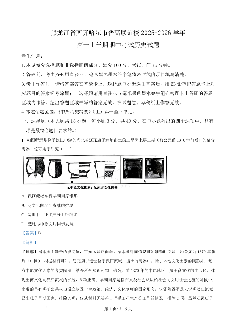 黑龙江省齐齐哈尔市普高联谊校2025-2026学年高一上学期期中考试 历史答案.docx