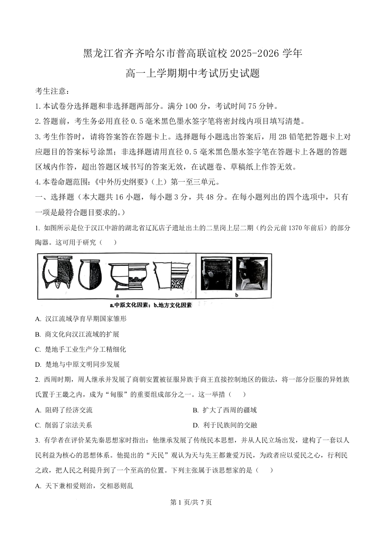 黑龙江省齐齐哈尔市普高联谊校2025-2026学年高一上学期期中考试 历史.docx