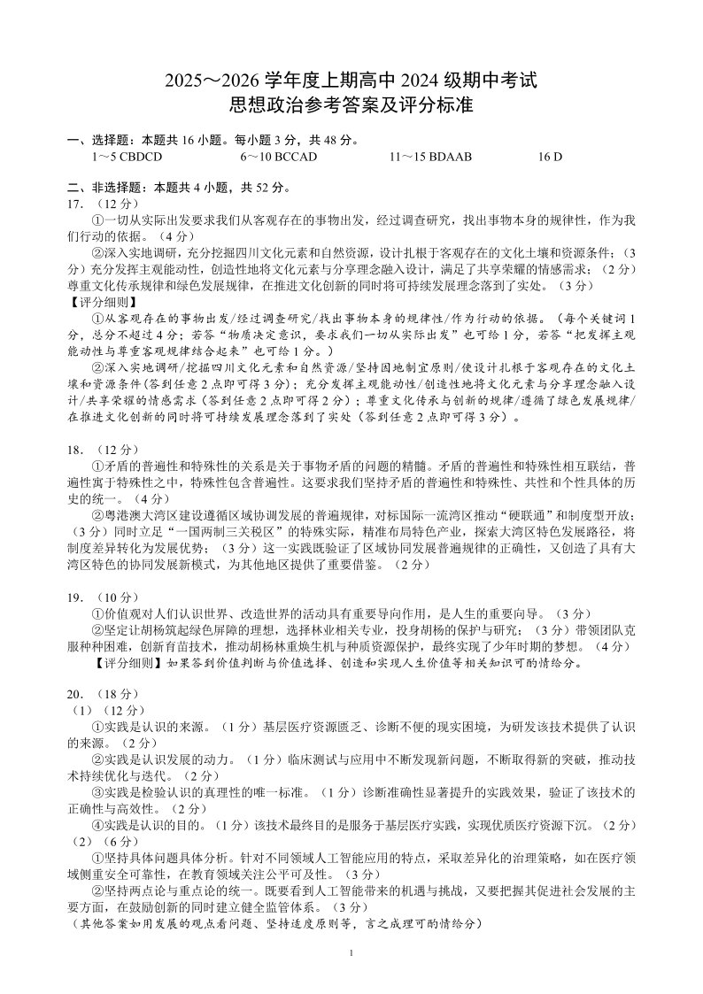 2025~2026学年度上期高中2024级期中考试 政治参考答案及评分标准.pdf