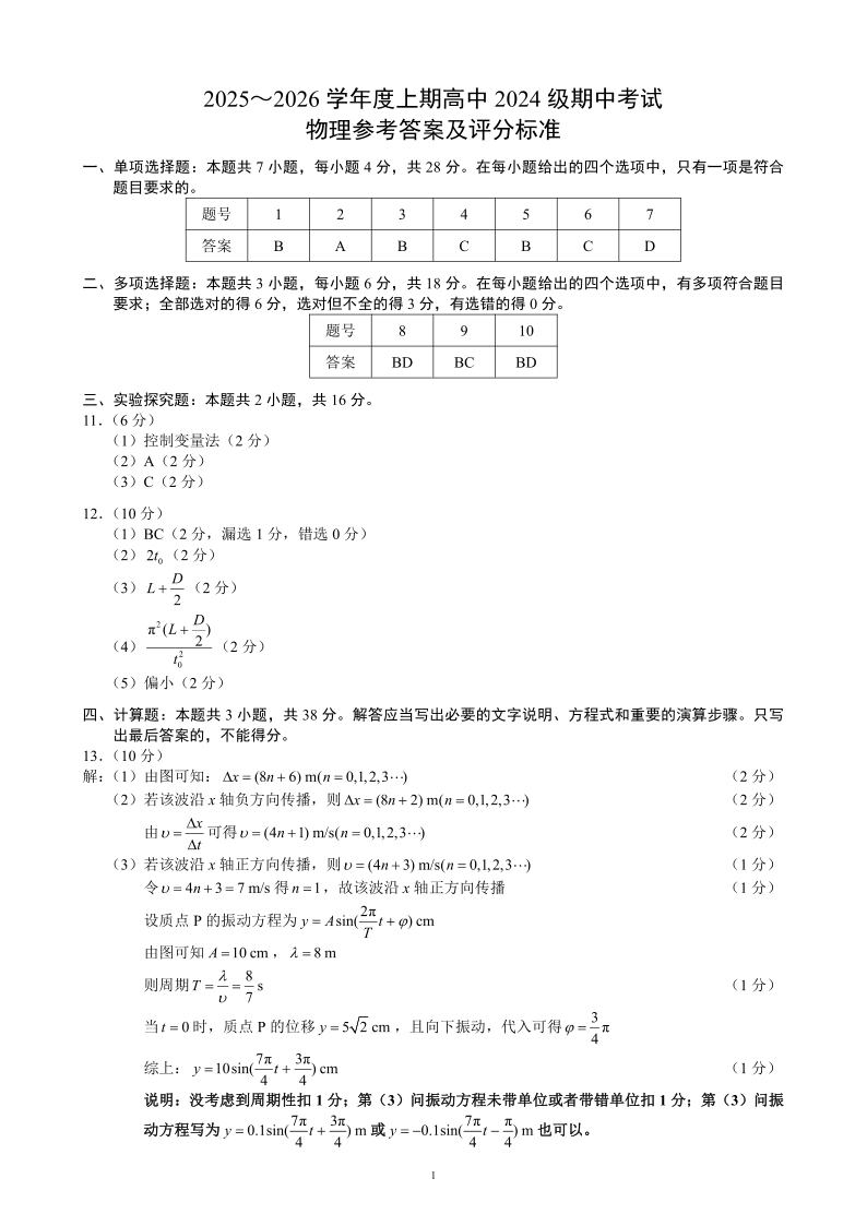 2025~2026学年度上期高中2024级期中考试 物理参考答案及评分标准.pdf