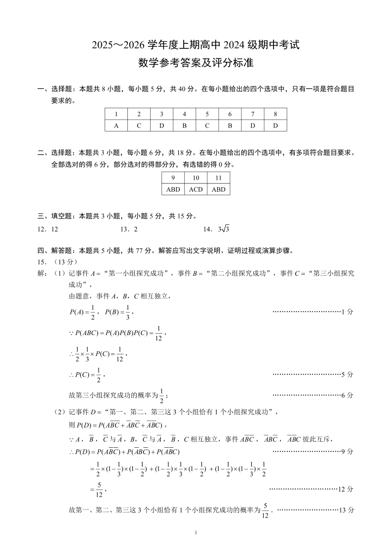 2025~2026学年度上期高中2024级期中考试 数学参考答案及评分标准.pdf
