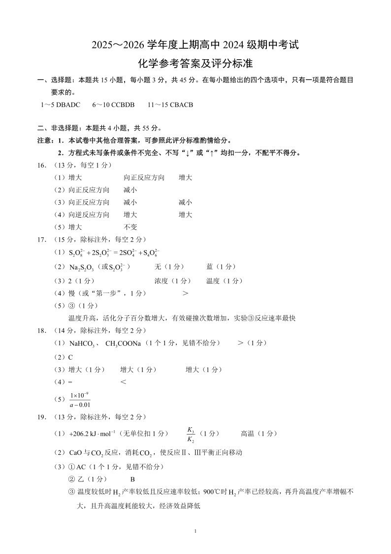 2025~2026学年度上期高中2024级期中考试 化学参考答案及评分标准.pdf