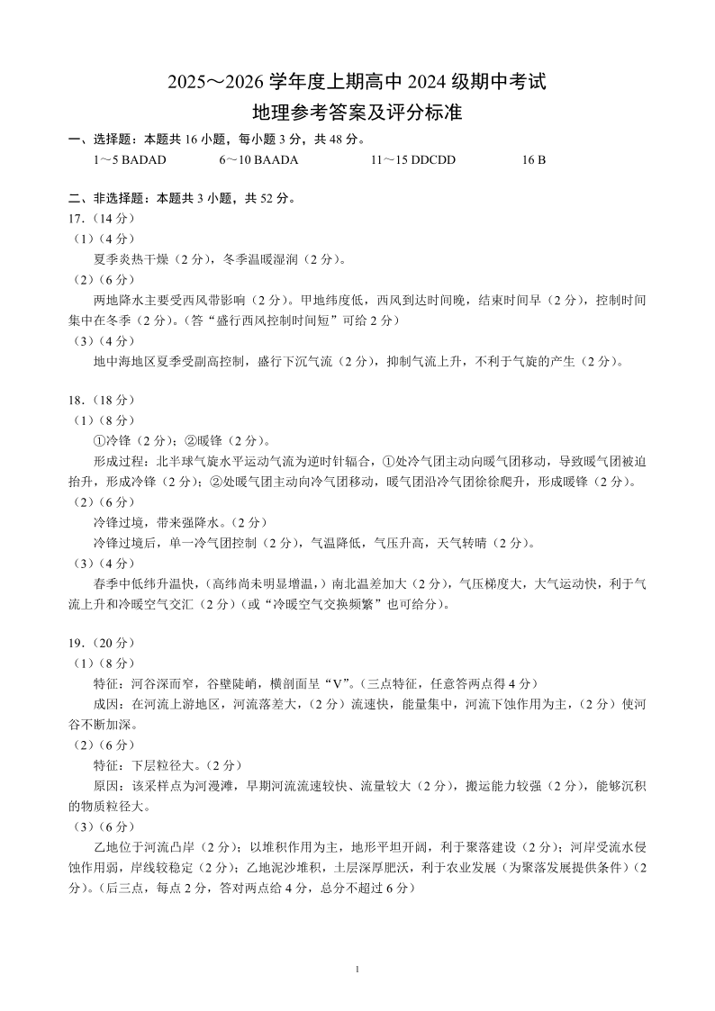 2025~2026学年度上期高中2024级期中考试 地理参考答案及评分标准.pdf