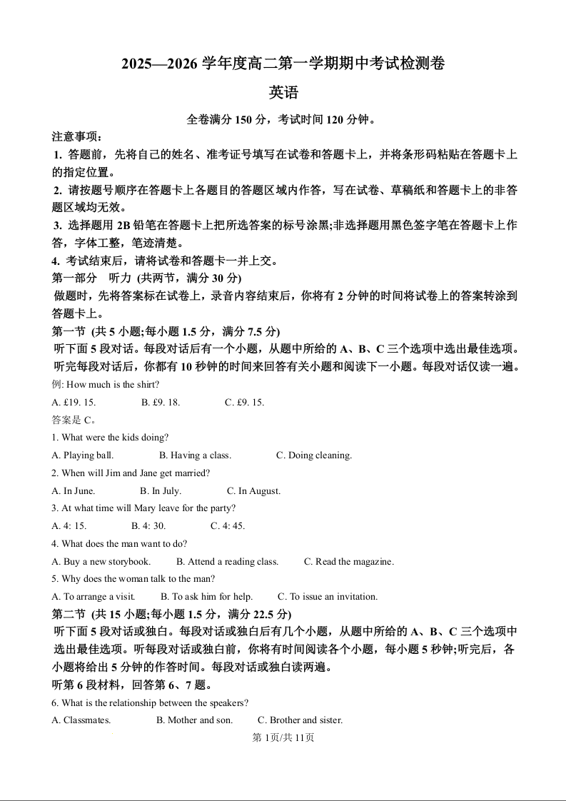 陕西省汉中市十校联考2025-2026学年高二上学期期中检测 英语.docx