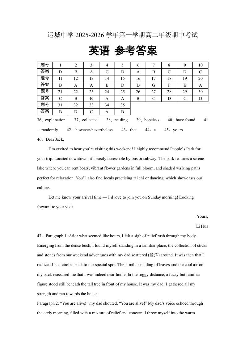 山西省运城中学2025-2026学年高二上学期期中考试 英语答案.docx
