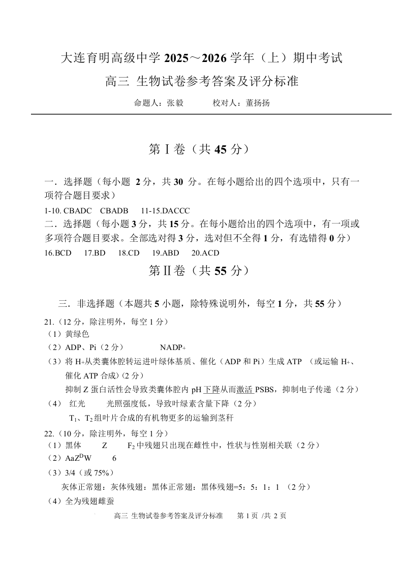 辽宁省大连育明高级中学2026届高三上学期11月期中考试 生物答案.docx