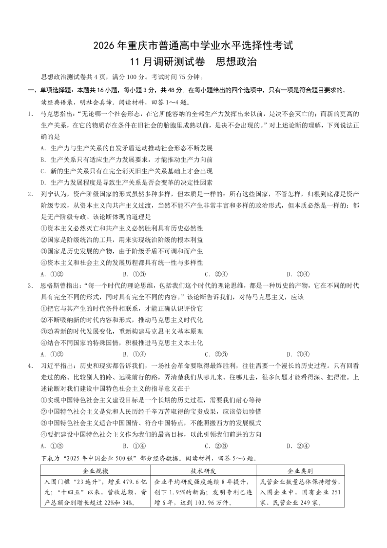 重庆市普通高中学业水平选择性考试11月调研测试卷 政治试题(含答案).pdf